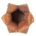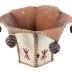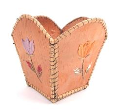 A small birchbark basket or box, probably made by an Indigenous person for the tourist trade. Six vertical panels, each trimmed with sweetgrass and cut to a point on one end, are sewn together to form the sides of the basket. This construction is then sewn to a six-sided, flat piece of bark to form the base. The point or tip of each of the side pieces is bent out and downward and a small pine cone is sewn to hang from each tip. Each side panel is then decorated with a simple porcupine quill pattern for decoration. There is some indication of additional porcupine work on the upper areas of each panel; however, the exact purpose of these quills is no longer apparent.