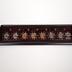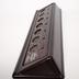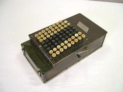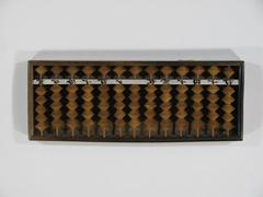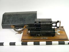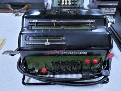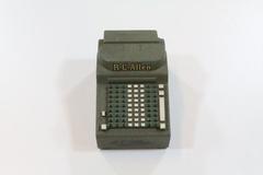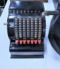 This manual calculator has seven rotating dials on its face. The calculator is made of metal, but with a wood grain finish. The calculator portion of the device can be removed from the trinagular base, and has a green felt bottom. The words, Lightning Calculator Company, Grand Rapids, Michigan, are in the lower right corner of the face.