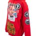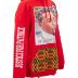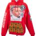 This hooded sweatshirt is made of red cotton and polyester and features an image on the front of Patrick Lyoya with the words "Justice for Patrick" across the top and bottom. Next to Lyoya's image are three patches: a circular Black Lives Matter fist that reads "Say His Name | No Justice No Peace", the US flag, and the Republic of Congo flag. The front pocket and hood interior are decorated with African-style fabric and the proper right sleeve reads "Justice for Patrick". The proper left sleeve has a patch for RegJames Klothing and another for Grand Rapids, Michigan.