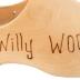 These wooden shoes, called clogs or klompen, were worn by a Willy Wood mascot during a Tulip Time parade in Holland, Michigan. Woodburned on the outer sides of both klomp is the name "Willy WOOD" and a sticker in each heel reads "Dutch Clogs | 29 cm | 44/45 | made in Holland". Willy Wood is the mascot for WOOD Radio station and was designed by Harry Wesslund in 1951.