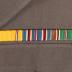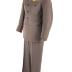 This military uniform is made of gray cotton twill and consists of two pieces that include a jacket and trousers. The jacket has Line Senior Commander shoulder boards on the shoulders and three ribbons on the proper left breast in the order that follows: American Defense Service Medal, American Campaign Medal, and European-African-Middle Eastern Campaign Medal. This uniform is accompanied by cover number 186223.