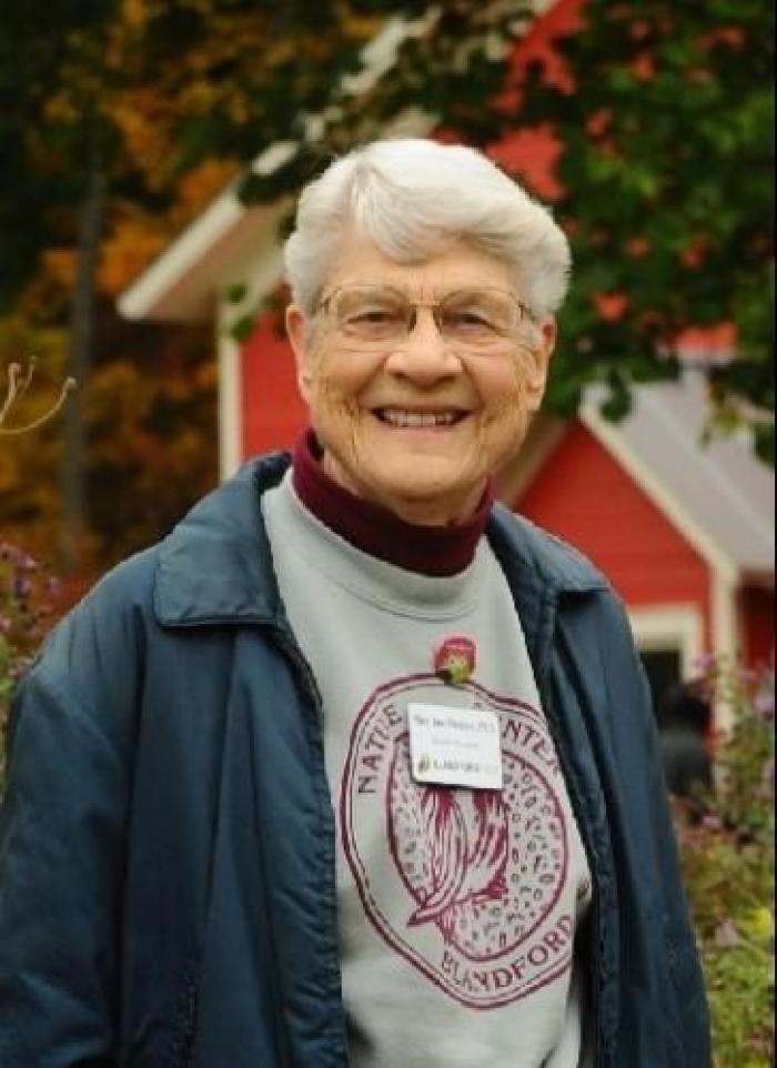 Dr. Mary Jane Dockeray (March 8, 1927 - August 18, 2020) was the founder of Blandford Nature Center who inspired thousands of children through her infectious love of nature. Dr. Dockeray was a pioneer in environmental education and was a local icon whose passion for inspiring people of all ages to fall in love with and protect nature. After graduating from Michigan State College with degrees in geology and environmental education, she worked as the Curator of Natural History at the Grand Rapids Public Museum. She visited schools, educating students about natural sciences and the environment. She authored the book "Let's Go Exploring: Suggestions for Field Trips and Associated Studies in Environmental-Conservation Education." Dockeray also wrote and produced a film titled "These Things Are Ours" viewed throughout the United States and Canada as part of lecture tours for the National Audubon Society. Dockeray will be remembered for many things, but she is perhaps best known for her classroom visits and lectures with her ancient slide projector. With this machine in hand, she brought nature to life through vivid imagery and stories that enthralled children and adults alike. She received numerous awards, including the Michigan Audubon Society Outstanding Member Award. She was also inducted into the Michigan Women's Hall of Fame. Most recently, she received the inaugural Association of Nature Center Administrators' President's Award for exemplary leadership in the Nature and Environmental Learning Center Profession. The Mary Jane Dockeray Scholarship fund was established at Grand Valley State University to recognize outstanding high school seniors planning on science careers. (Source: MLIVE Obituary)
